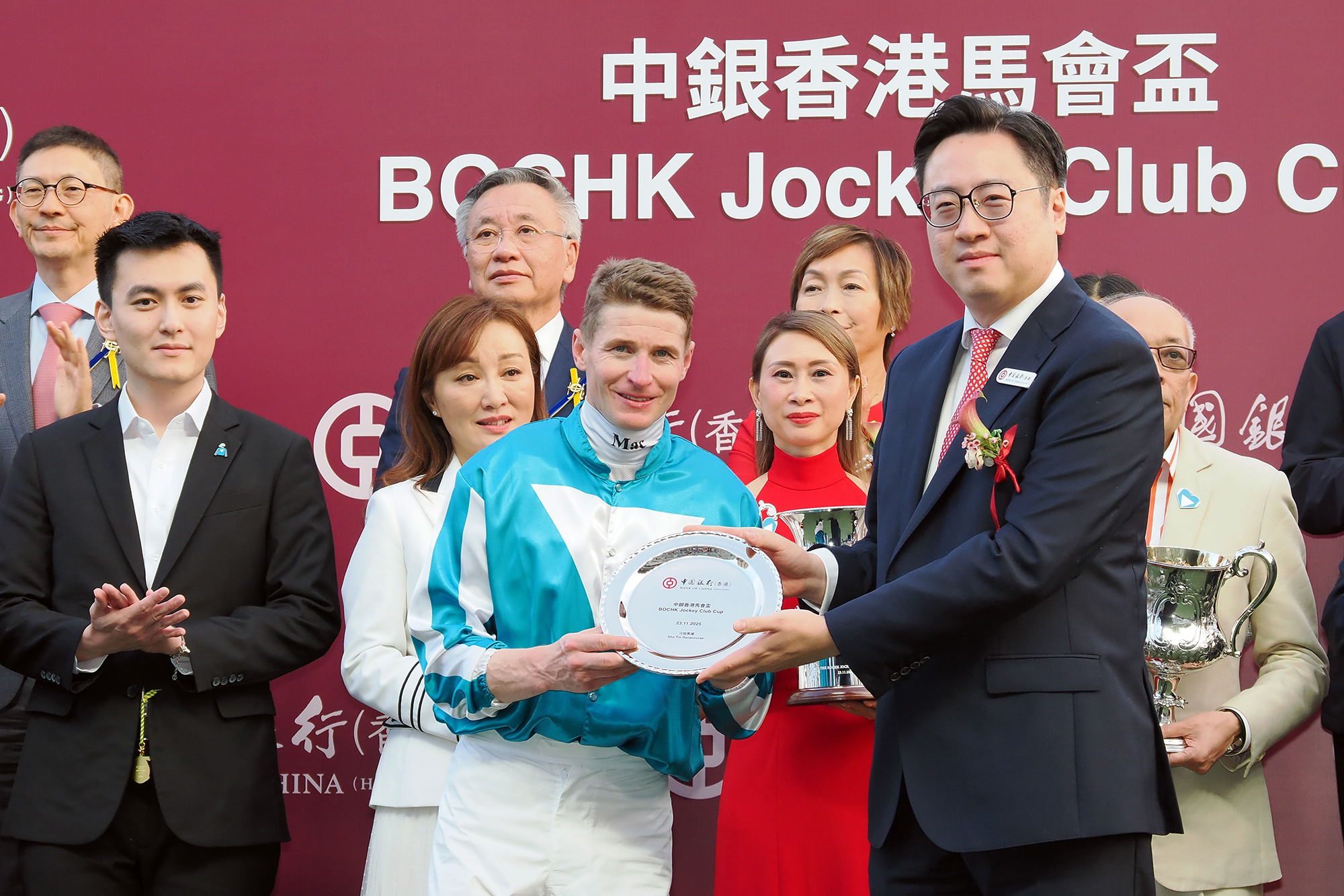 Arnold Chow, General Manager of Personal Banking Product Department, Bank of China (Hong Kong) Limited, presents a silver dish to winning jockey James McDonald.