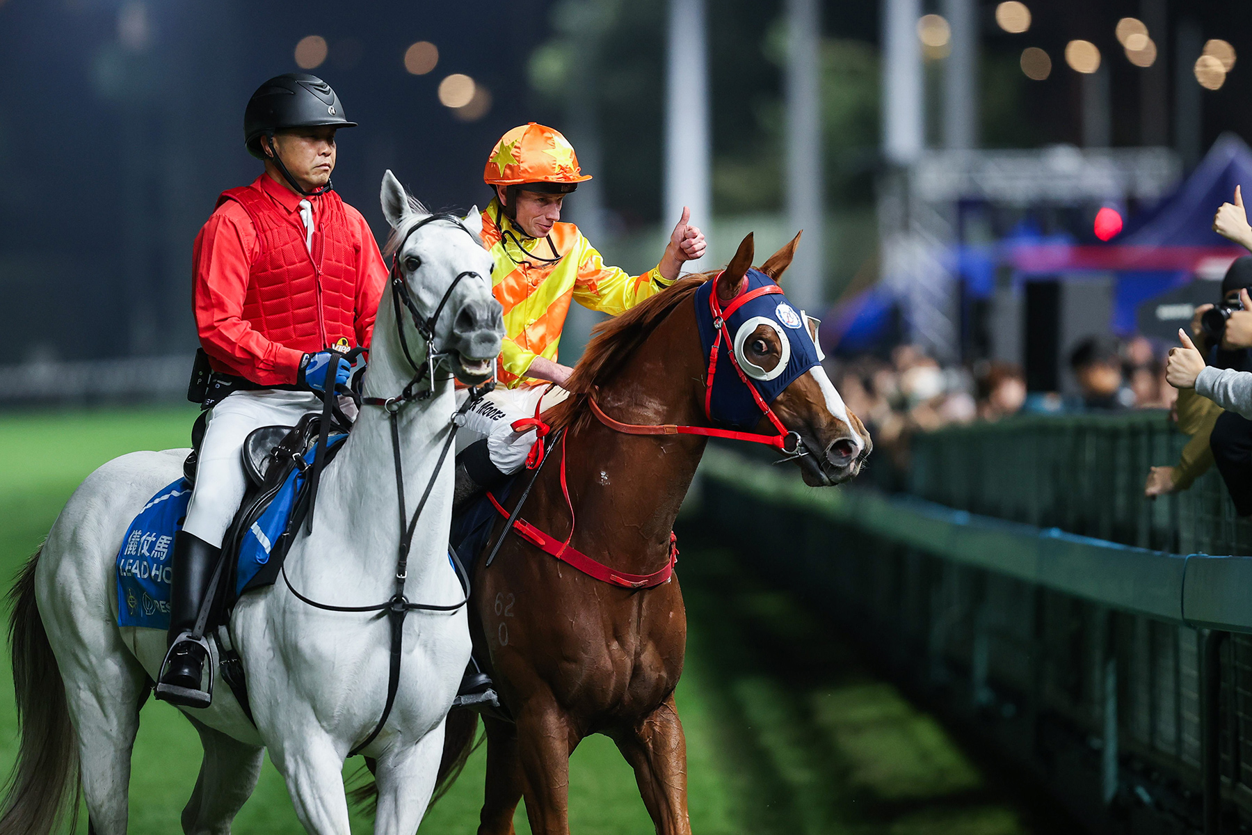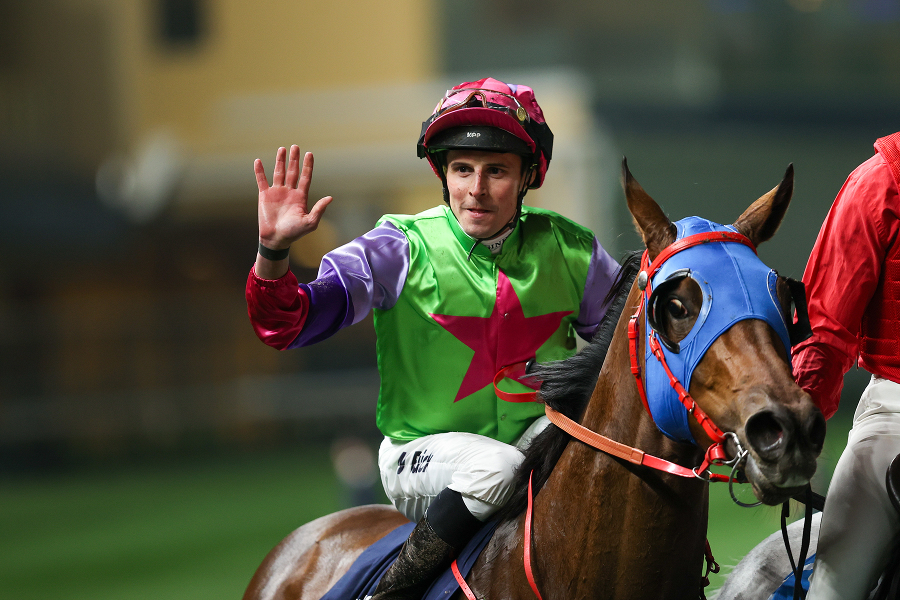 William Buick partners Bunta Baby (No. 11) to victory in the 1st Leg of the LONGINES International Jockeys’ Championship at Happy Valley tonight (Wednesday, 10 December).