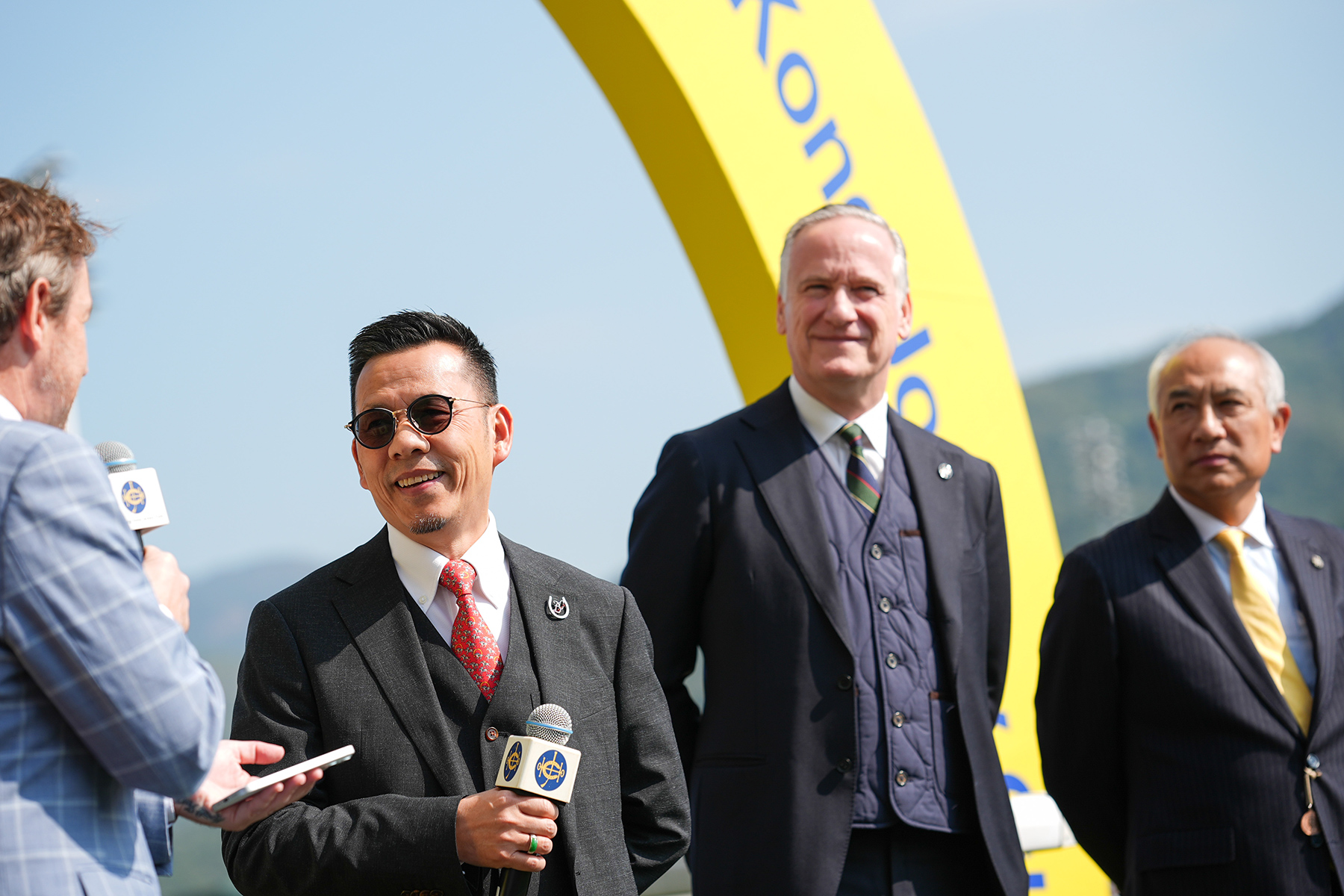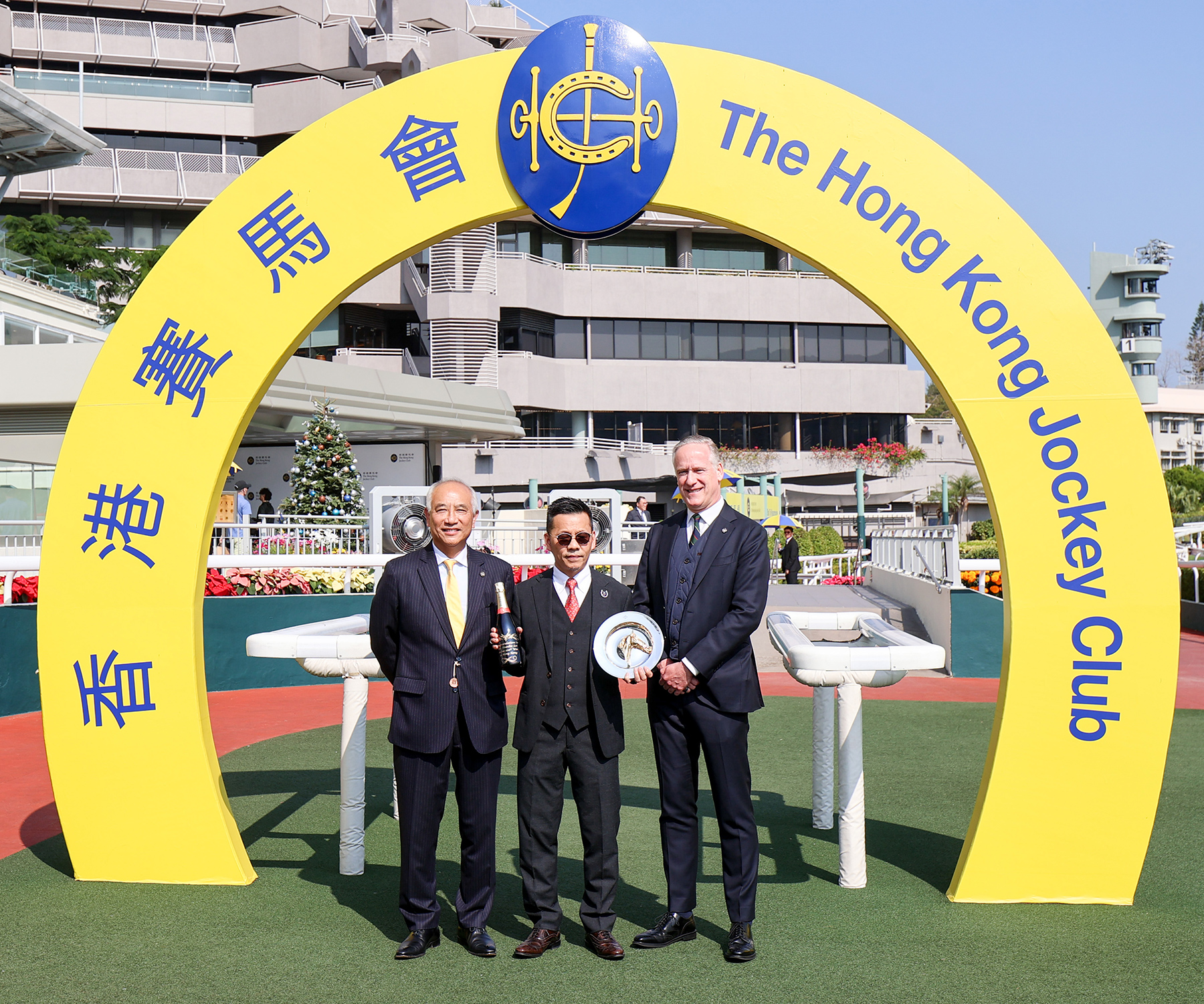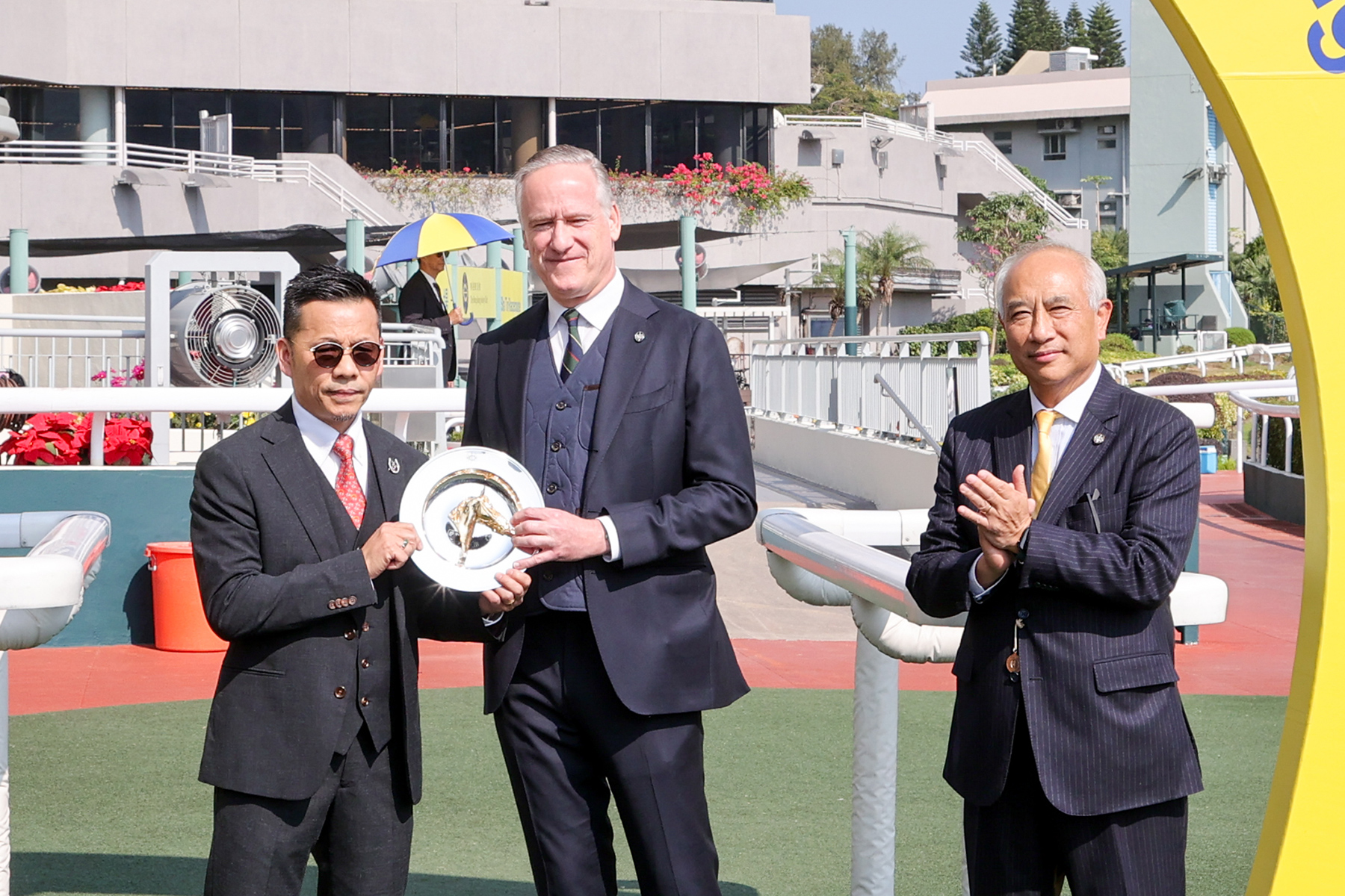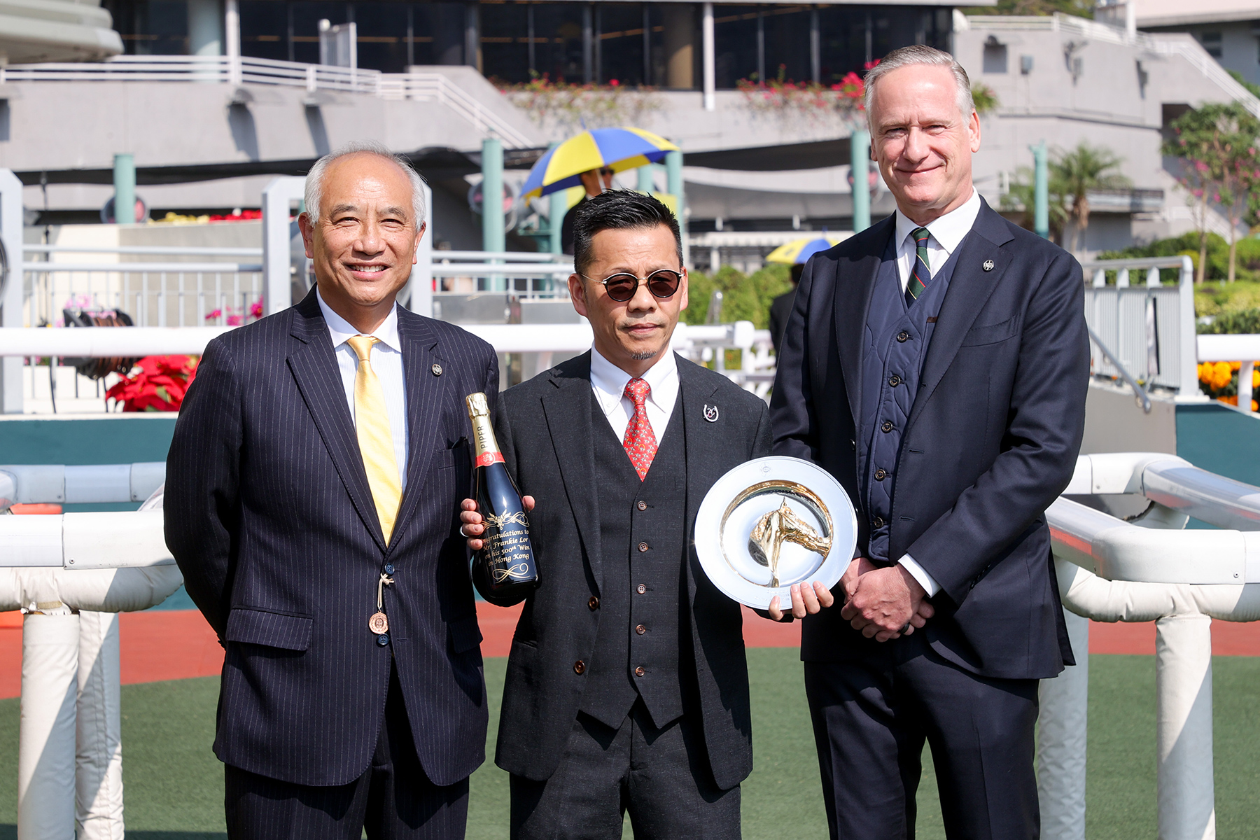 Acting Chief Executive Officer, Moray Taylor-Smith and Acting Executive Director of Racing, K L Cheng, The Hong Kong Jockey Club present a silver dish and a bottle of champagne to trainer Frankie Lor.