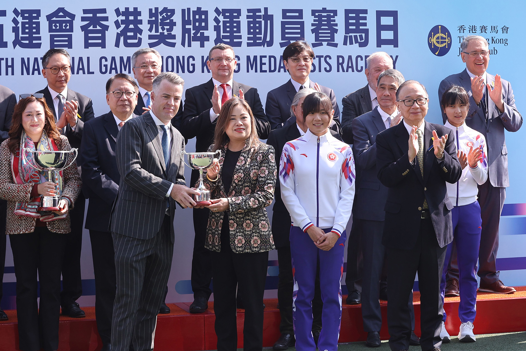 The Honourable Eric Chan Kwok-ki GBS IDSM JP, the Chief Secretary for Administration of the Government of the Hong Kong Special Administrative Region is accompanied by Lee Sze-wing, Cycling Gold Medallist at the 15th National Games, to present the 15th National Games Hong Kong Medallists Cup trophy to Yvonne Tam, the owner representative for the 25/26 Jamie Richards Trainer Syndicate, owners of City Gold Banner.