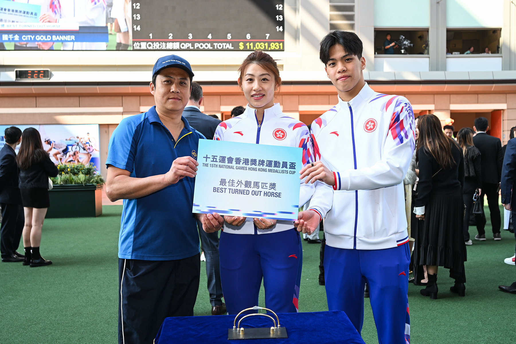 Mak Sai-ting, Swimming Bronze Medallist of the 15th National Games and Hsieh Sin-yan, Fencing Bronze Medallist of the 15th National Games present Jamie Richards’ stable assistant, responsible for City Gold Banner, prize of the Best Turned Out Horse prior to 15th National Games Hong Kong Medallists Cup.