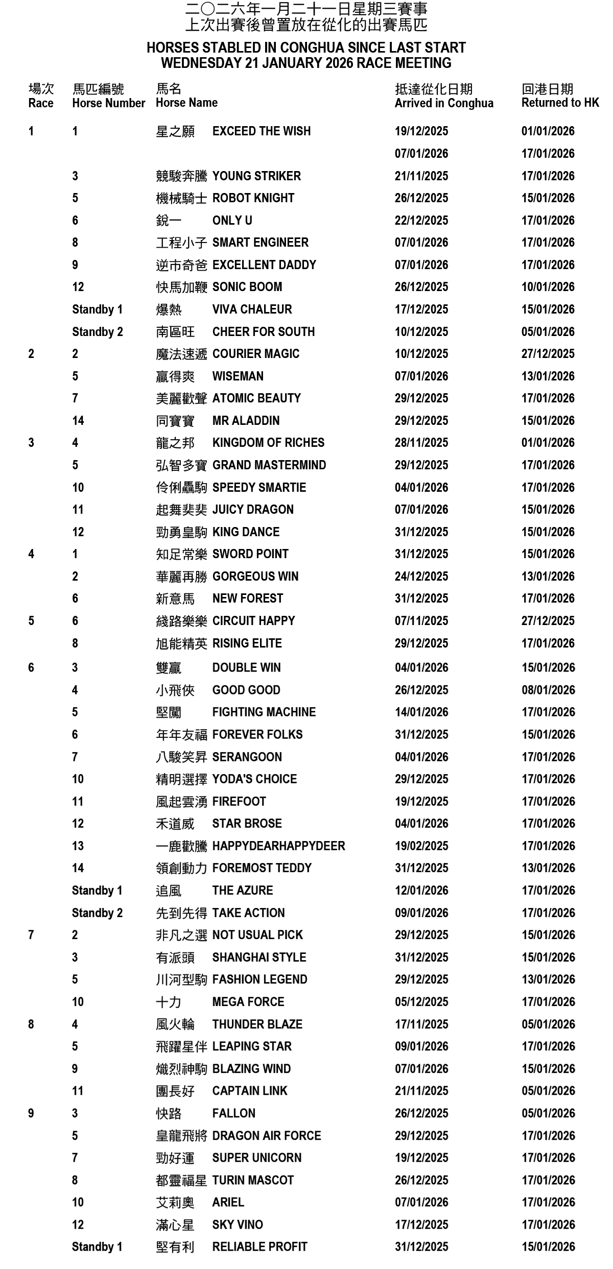 Horses stabled in Conghua since last start – Wednesday 21 January 2026 race meeting