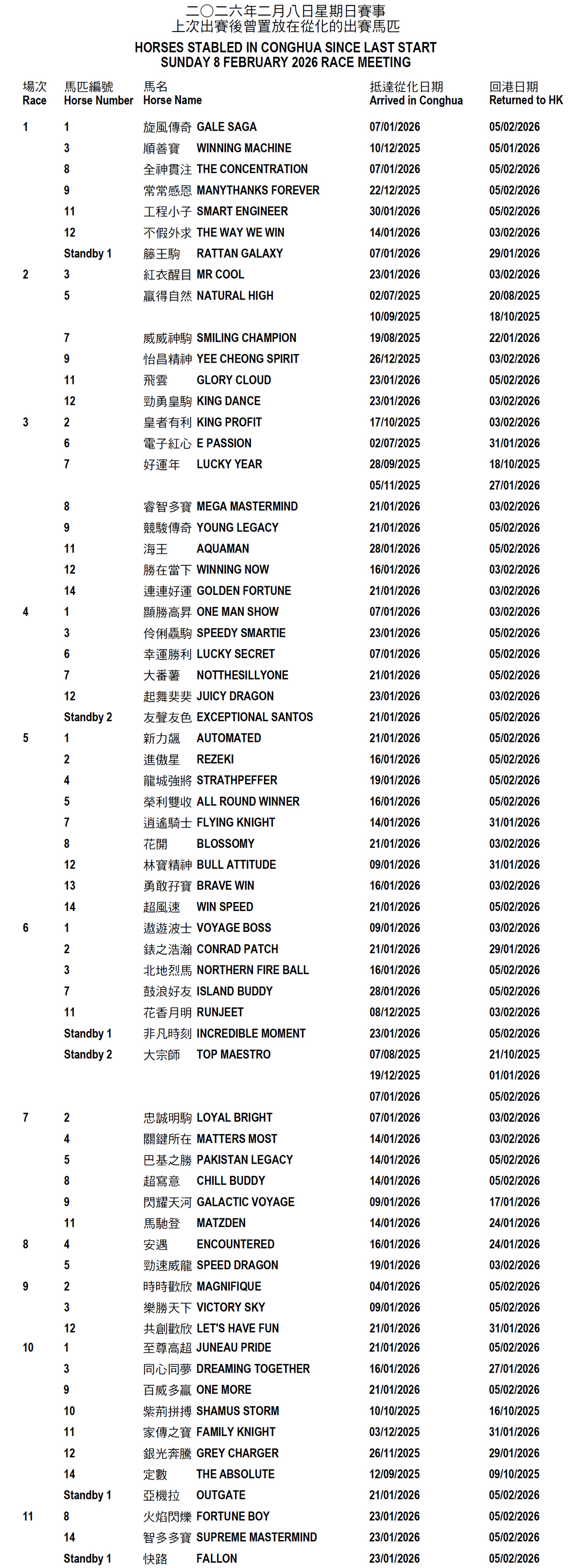 Sunday 8 February 2026 race meeting – Horses stabled in Conghua since last start