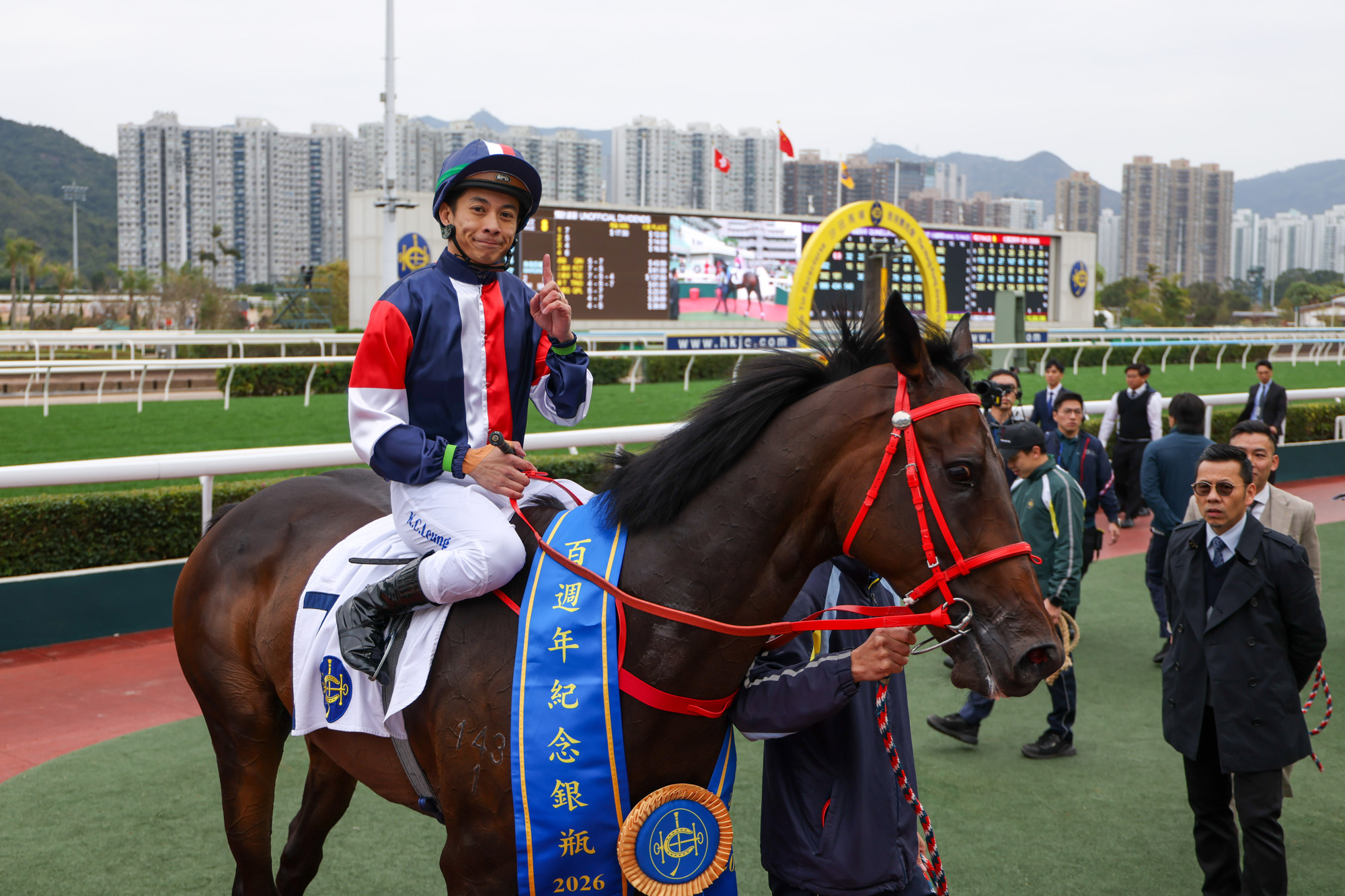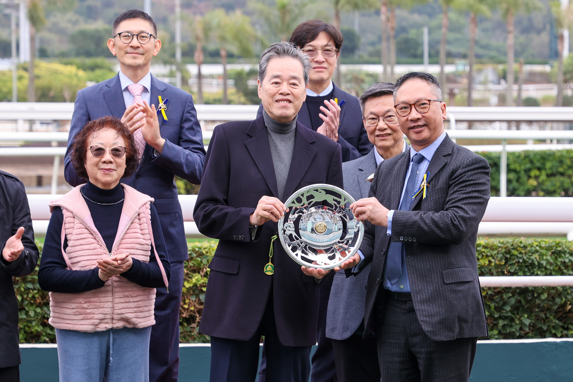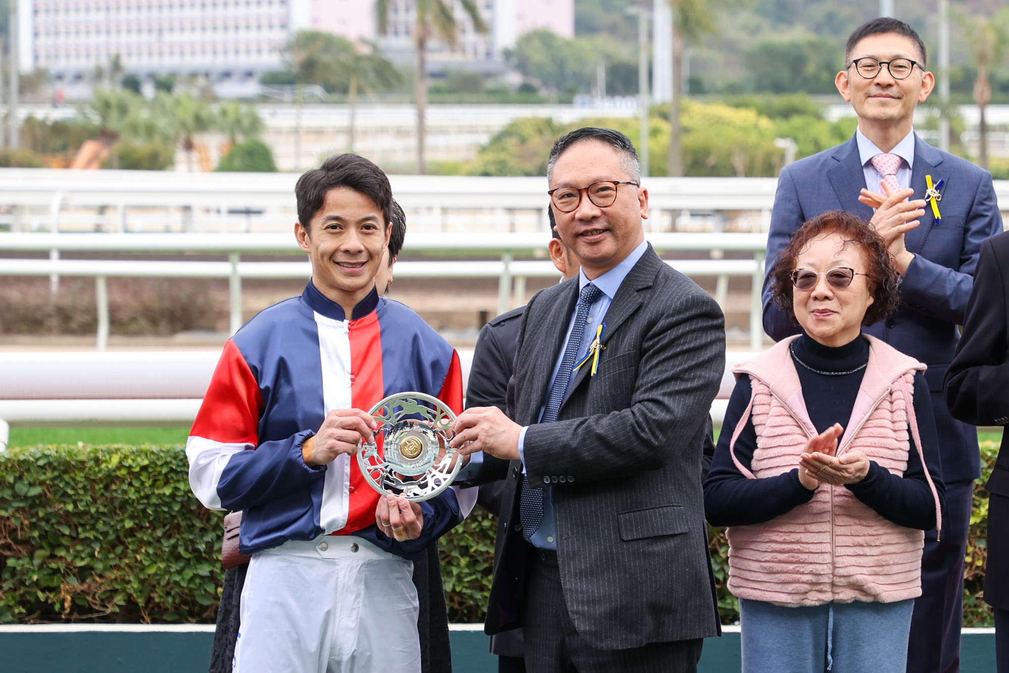 The Hon Rimsky Yuen, Steward, The Hong Kong Jockey Club, presents the trophy and a silver dish to Numbers’ owner representatives of the 23/24 Frankie Lor Fu Chuen Trainer Syndicate and the silver dishes to winning trainer Frankie Lor and jockey Derek Leung.