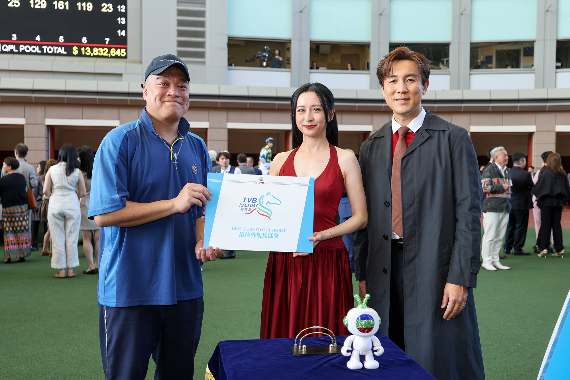 Shaun Tam and Katy Kung, renowned Hong Kong artists, present a prize and a TVBuddy souvenir to the Stable Assistant responsible for Sky Trust, Best Turned Out Horse in the TVB Cup.