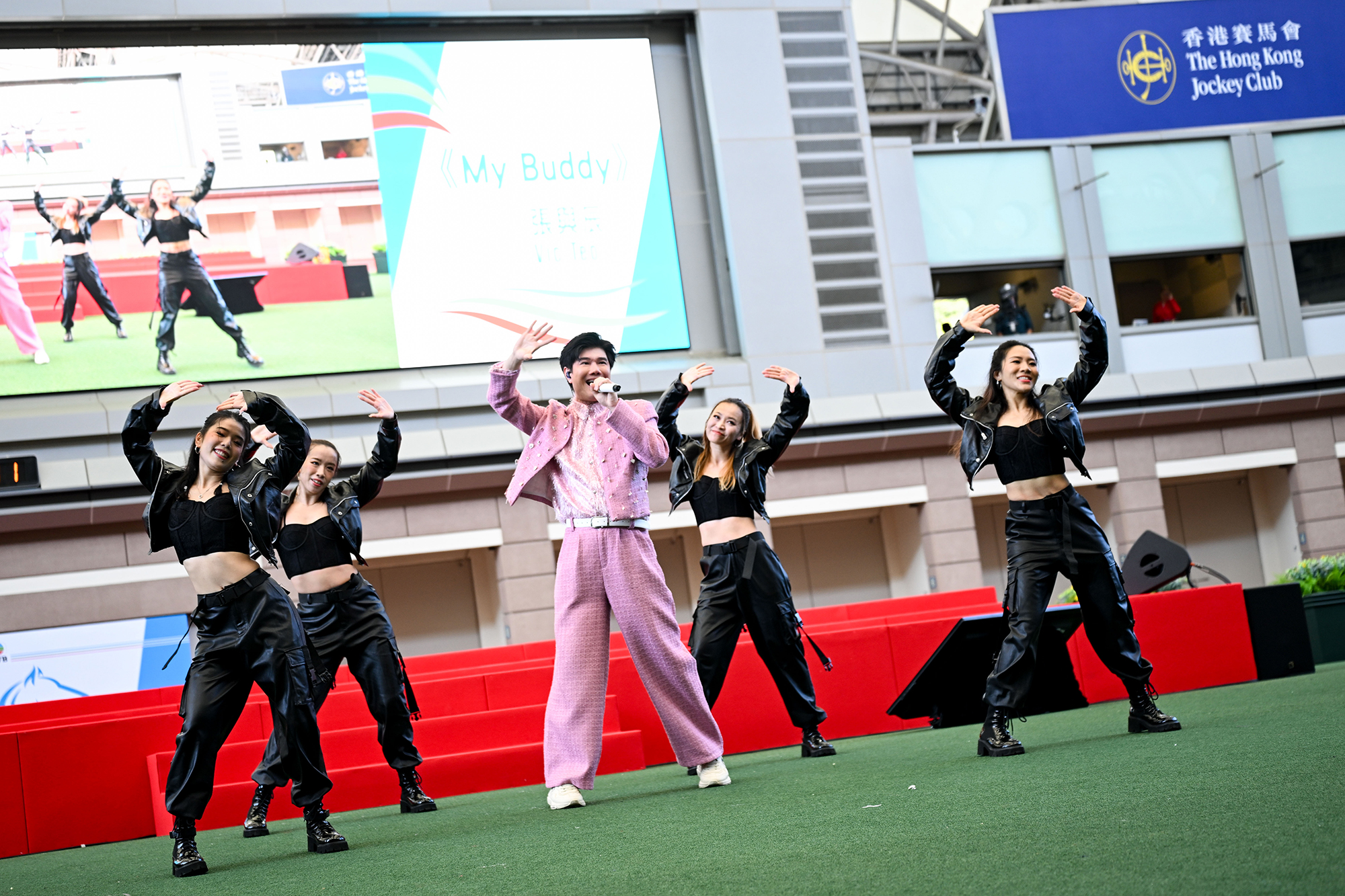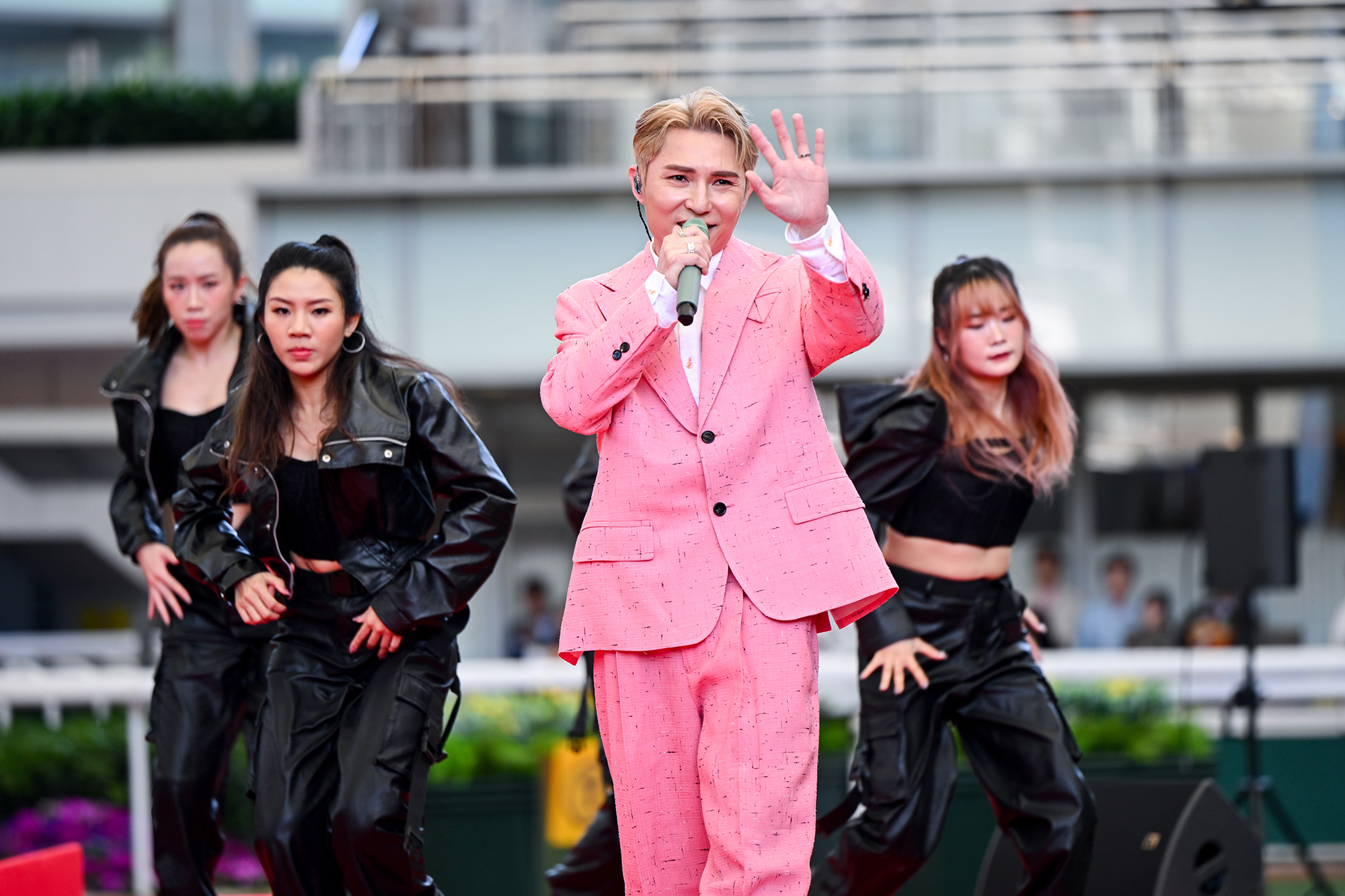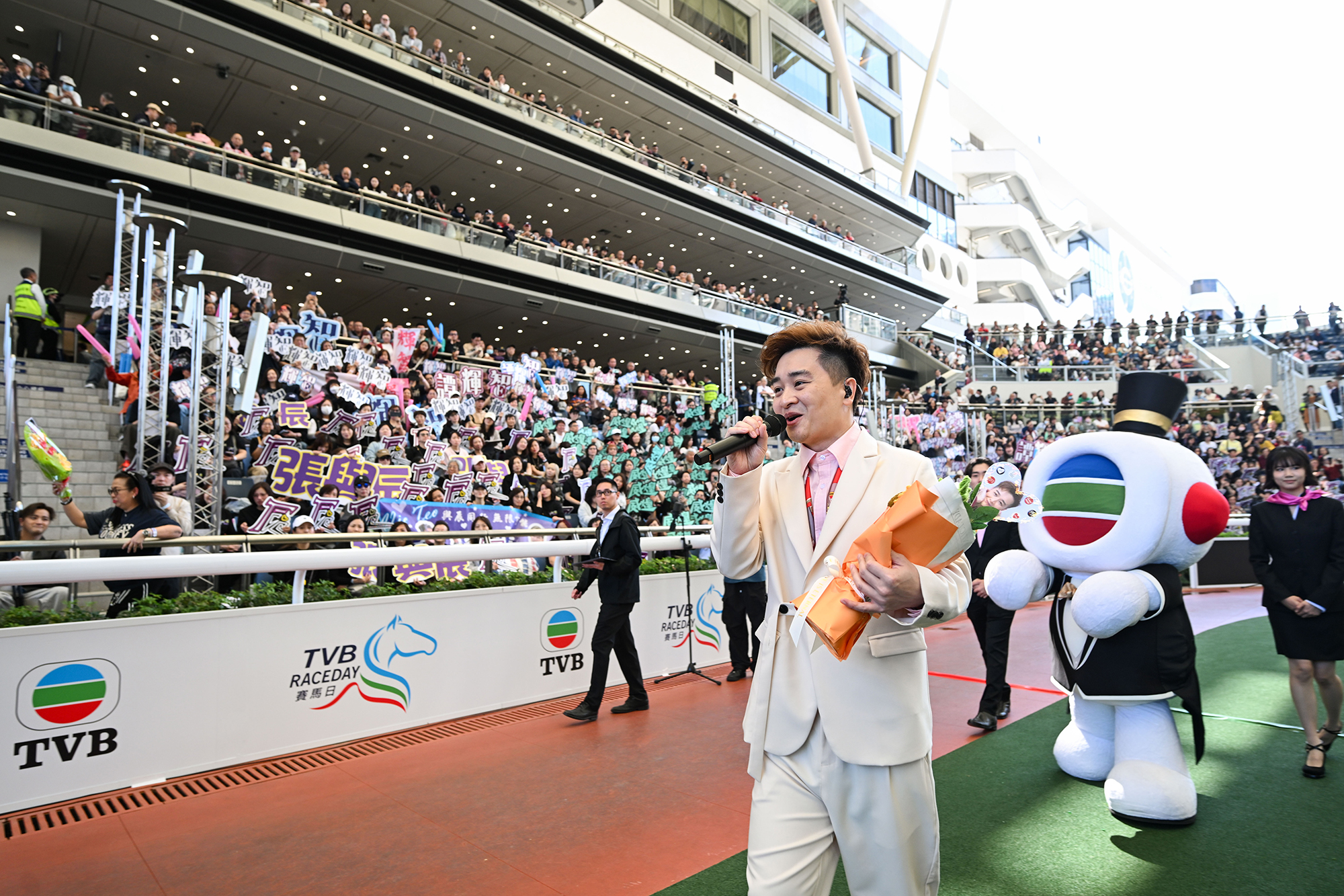 TVB artist Rax Teh performs live for racegoers at Sha Tin during race intervals.