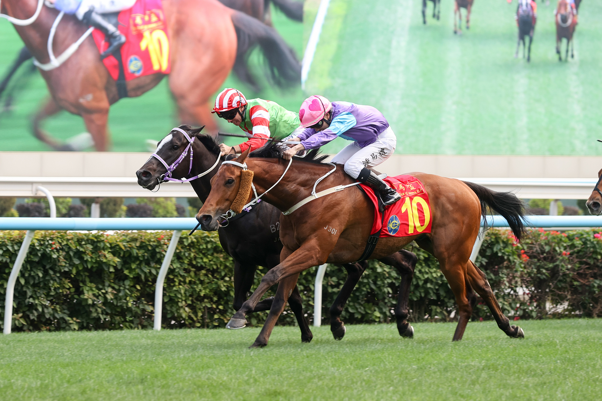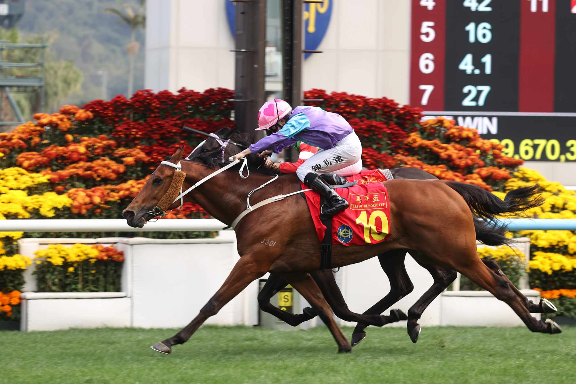 The Tony Cruz-trained Stunning Peach ridden by Angus Chung takes the HK$3.12 million Class 2 The Year Of The Horse Cup Handicap (1600m) at the Year Of The Horse Raceday at Sha Tin Racecourse today (Thursday, 19 February), scoring his first win this season.