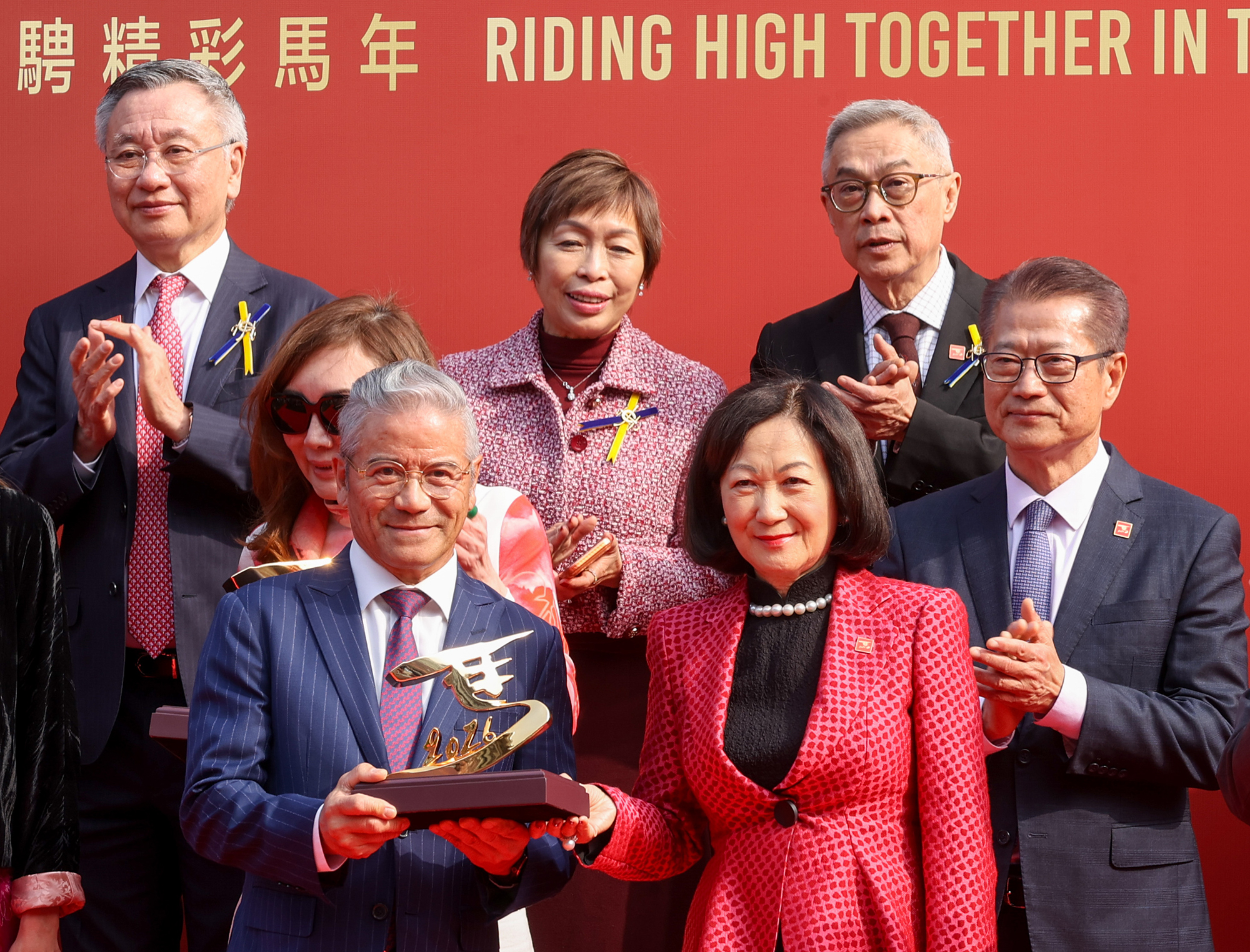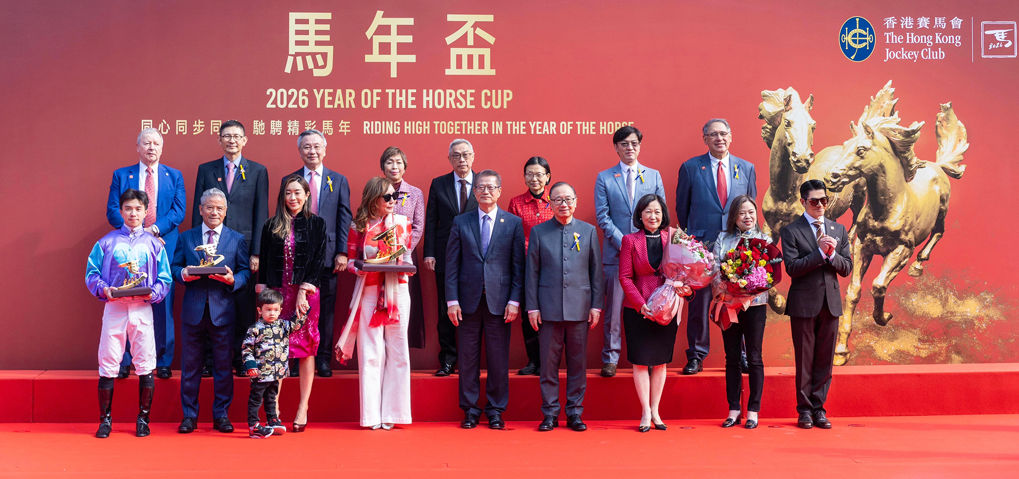 At the presentation ceremony, The Honourable Paul Chan Mo-po GBM GBS MH JP, Financial Secretary of the Government of the Hong Kong Special Administrative Region presents The Year Of The Horse Cup trophy to winning owner representative of the Mahogany Syndicate, and The Honourable Regina Ip Lau Suk-yee GBM GBS JP, Convenor of the Non-official Members of the Executive Council of the Hong Kong Special Administrative Region and The Honourable Rosanna Law Shuk-pui JP, Secretary for Culture, Sports and Tourism of the Government of the Hong Kong Special Administrative Region present specially designed trophies to winning trainer Tony Cruz and jockey Angus Chung, respectively.