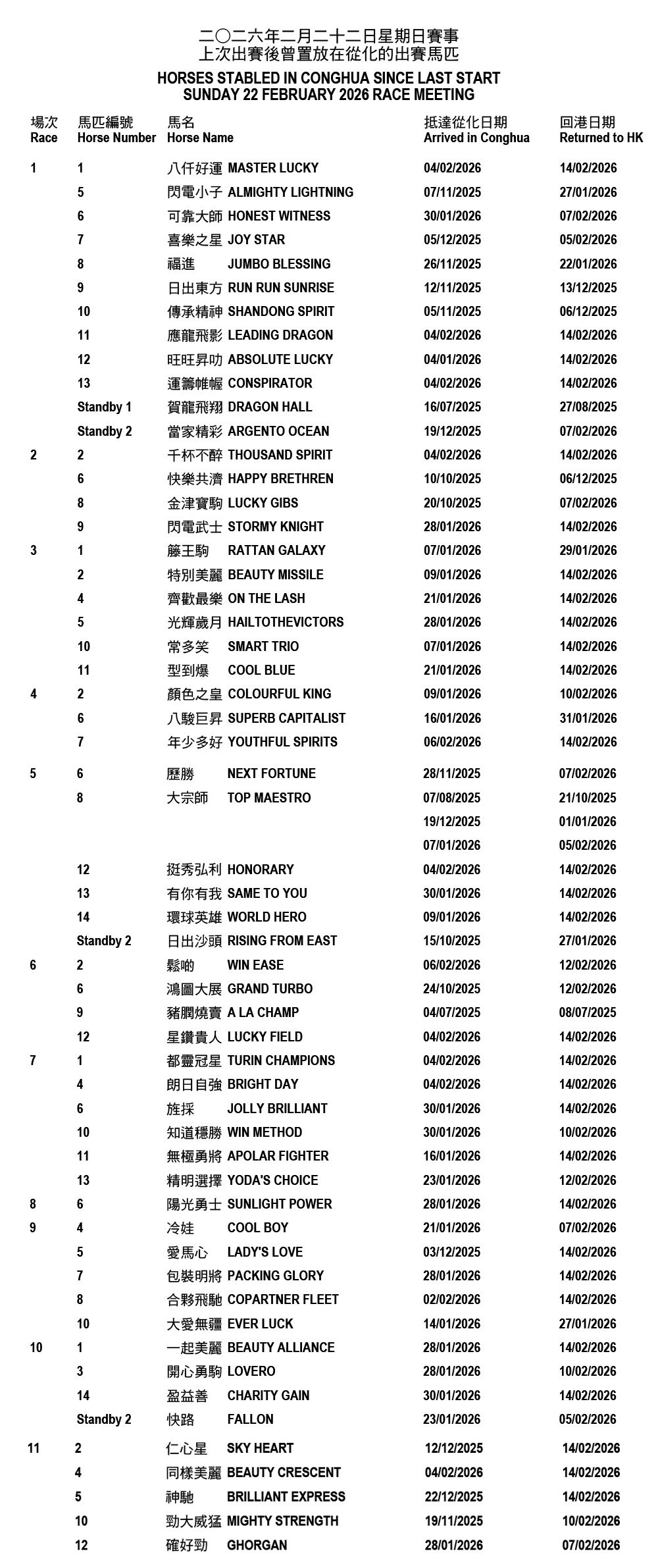 Sunday 22 February 2026 race meeting – Horses stabled in Conghua since last start