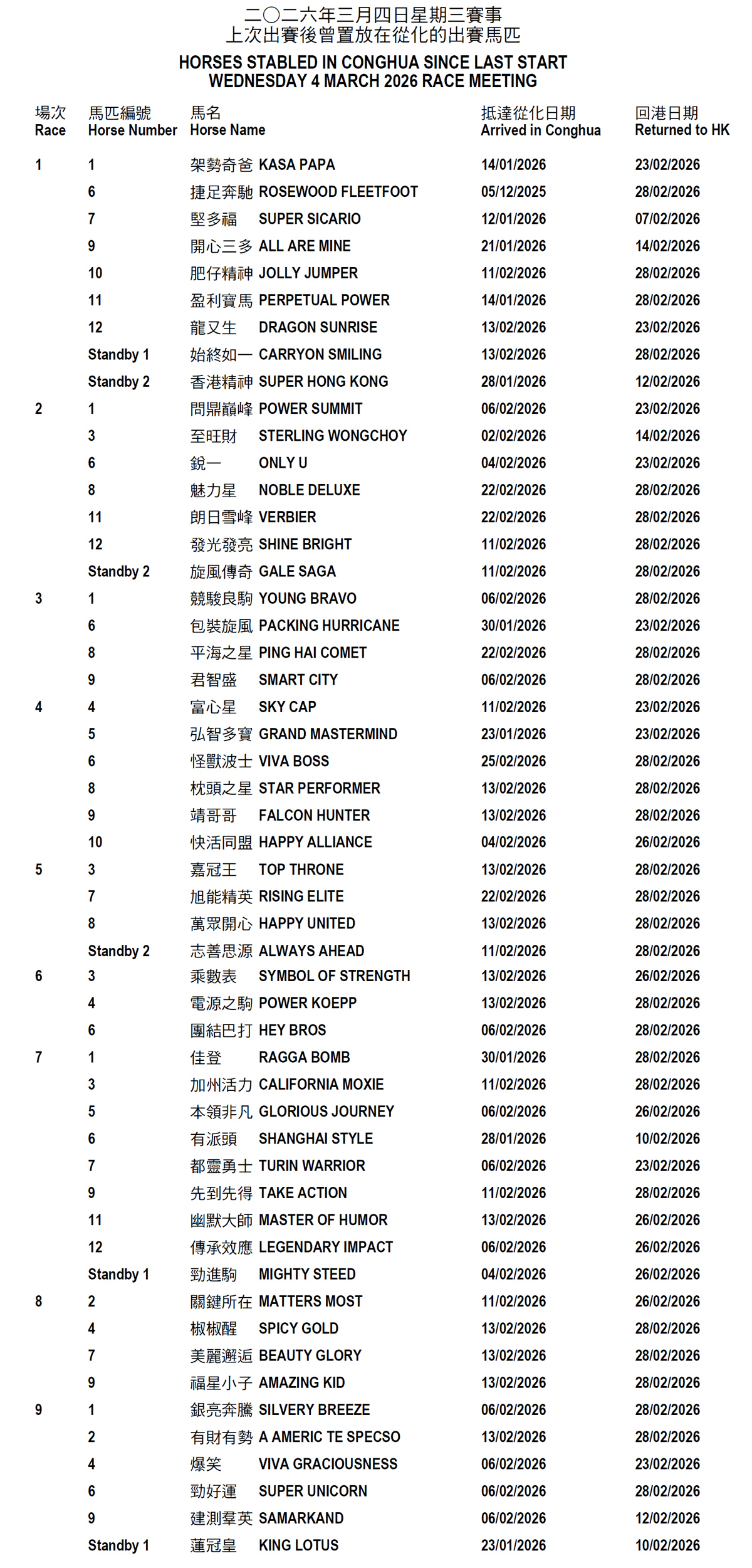 Horses stabled in Conghua since last start – Wednesday 4 March 2026 Race Meeting