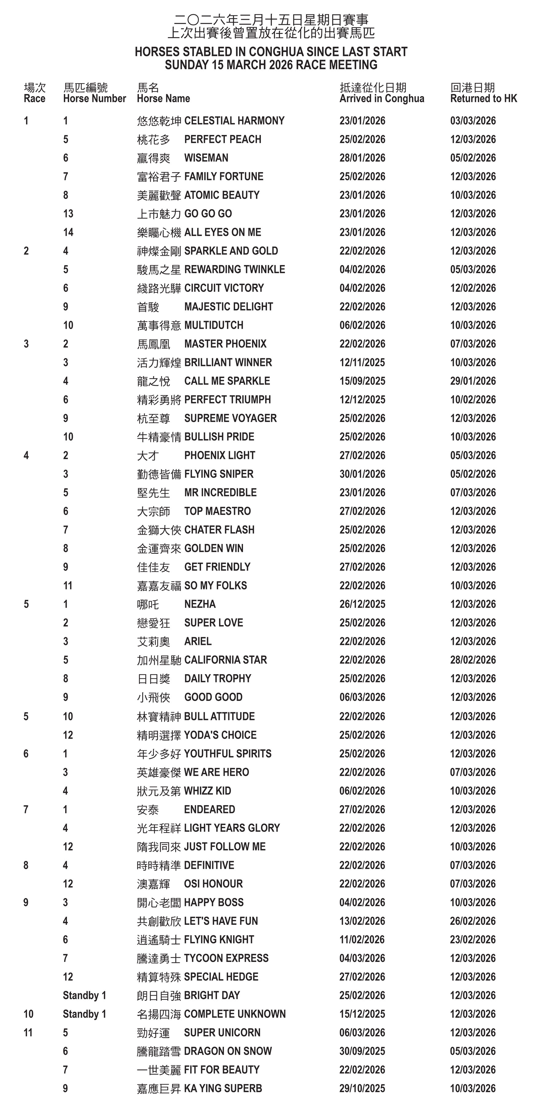 Horses stabled in Conghua since last start – Wednesday 11 March 2026 race meeting