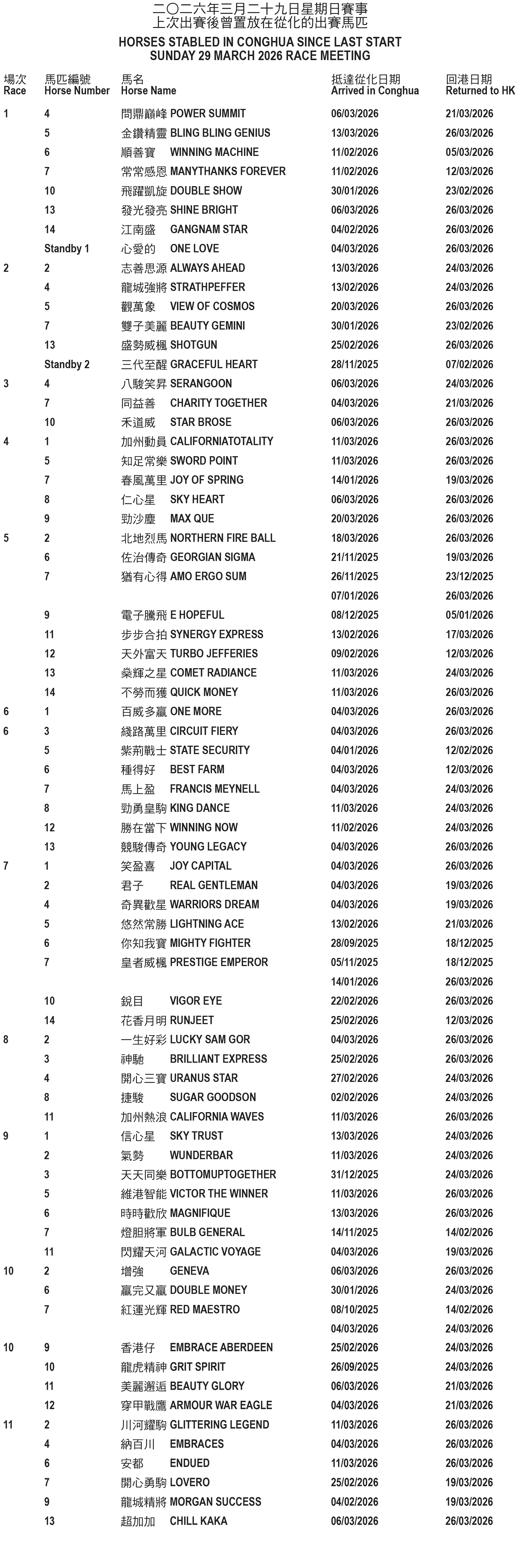 Horses stabled in Conghua since last start – Sunday 29 March 2026 Race Meeting
