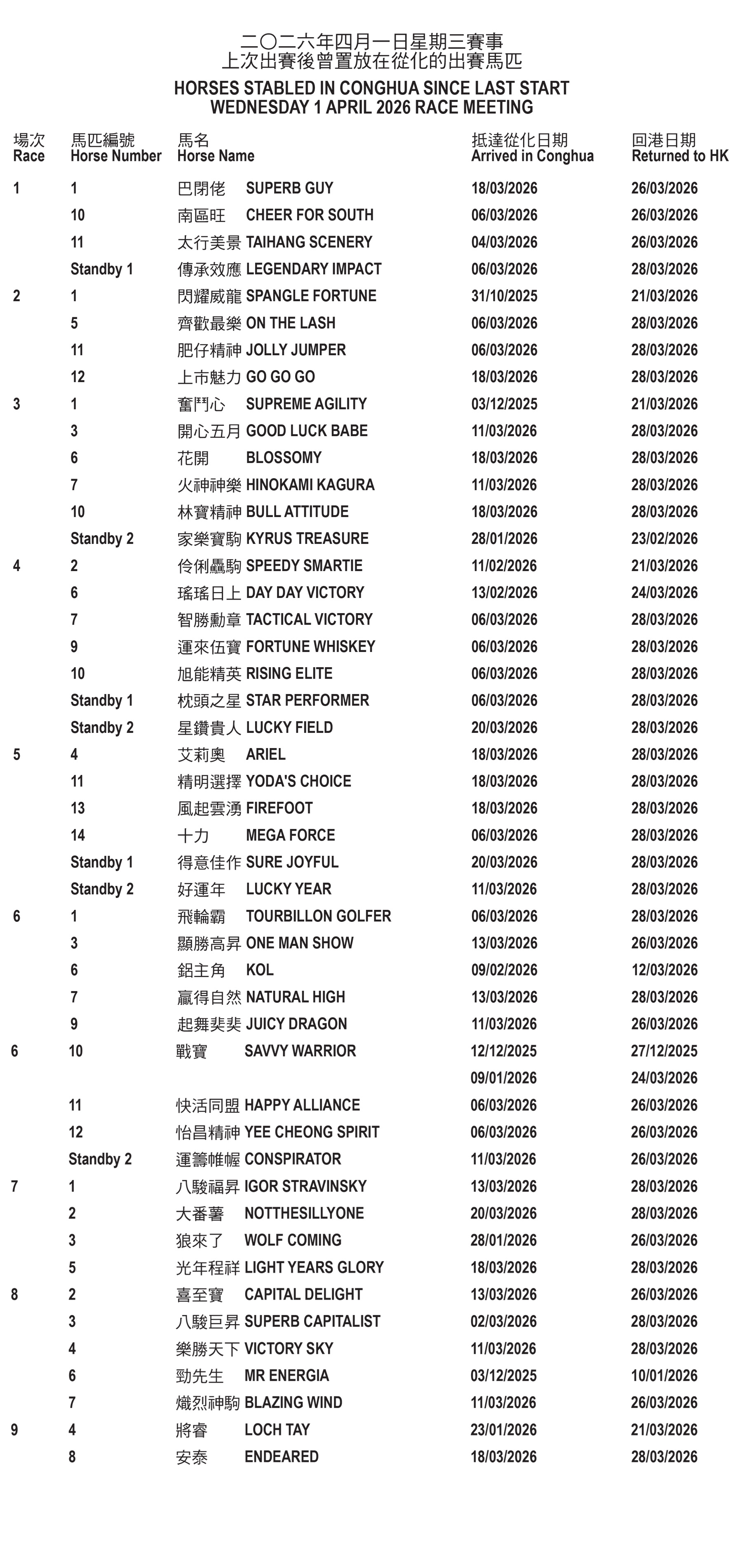 Horses stabled in Conghua since last start – Wednesday 25 March 2026 Race Meeting