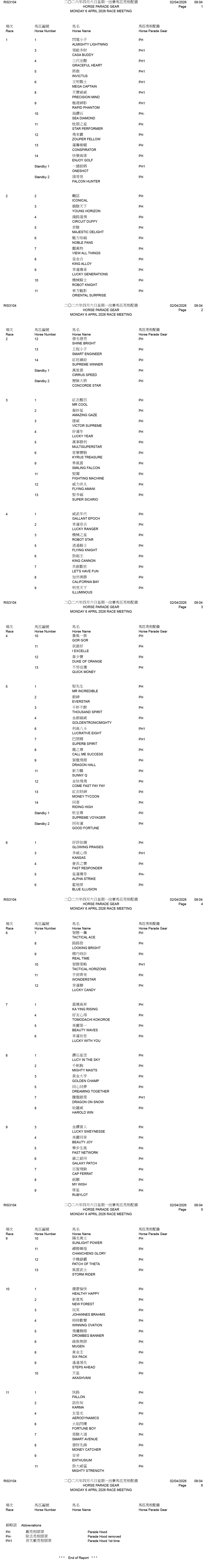 Horses stabled in Conghua since last start – Monday 6 April 2026 Race Meeting