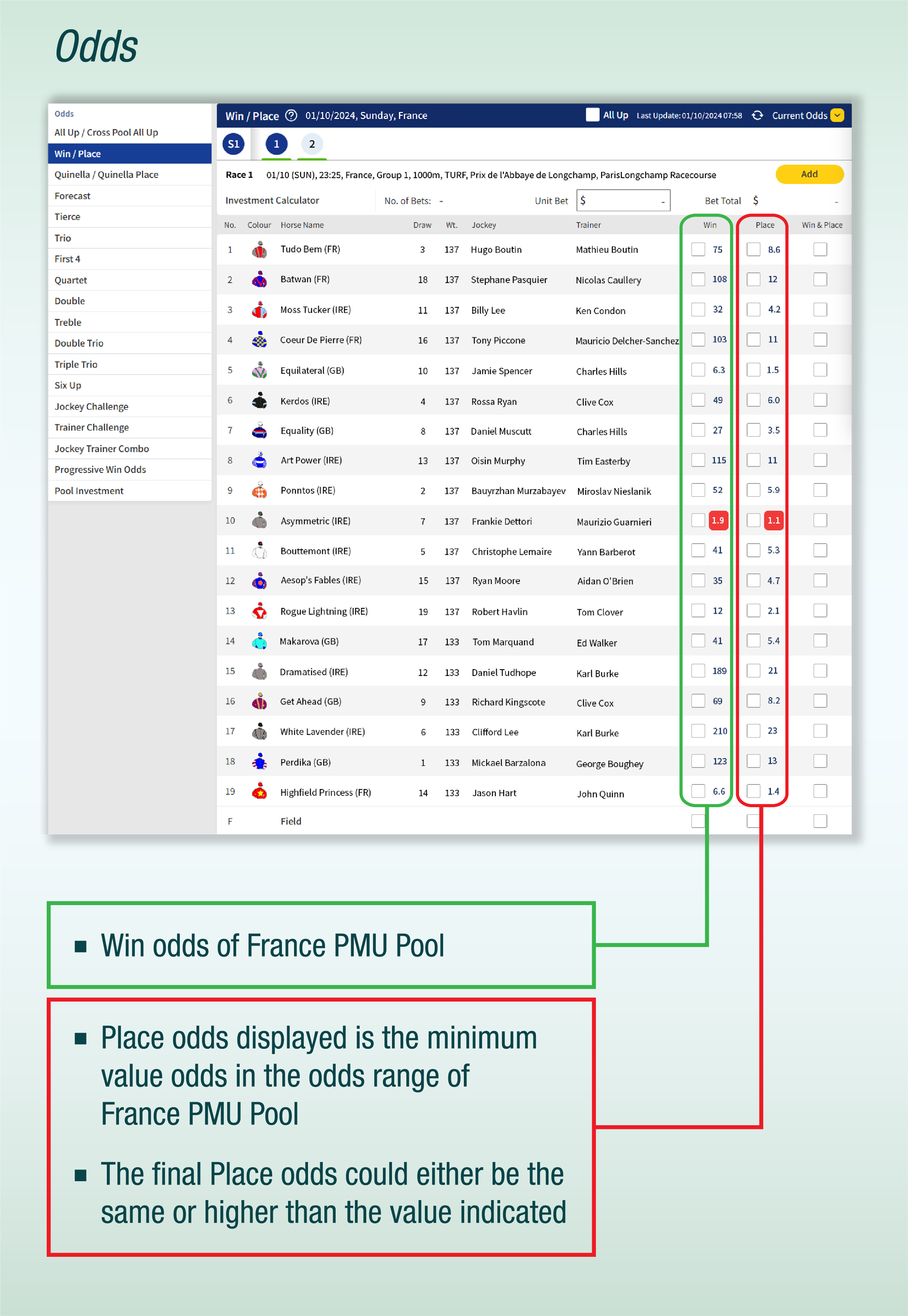 As with previous arrangements for the French Outbound Commingling pools△, Win and Place bets will be outbound commingled with the respective pools operated by PMU, in accordance with the modified horse race betting rules of PMU. Quinella, Quinella Place and other exotic pools will still be operated under separate Hong Kong pools.
